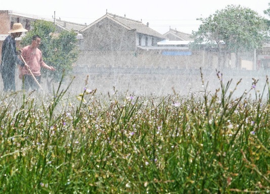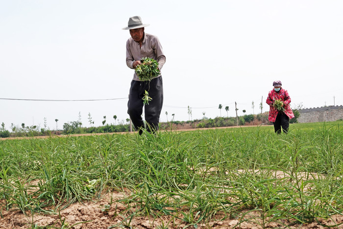 5月8日,运城市新绛县峨嵋岭上阳王镇北池村,药农们在加紧除草浇灌劳作。近年来,昔日靠天吃饭的峨嵋岭上旱垣丘陵地阳王镇,如今“龙头药业+现代基地+智慧医养+智能托管+农户”融合发展新型产业链遍及峨嵋岭。中药材种植面积加速提质发展达3万多亩20多种,年产达2万吨,产值3600多万元。