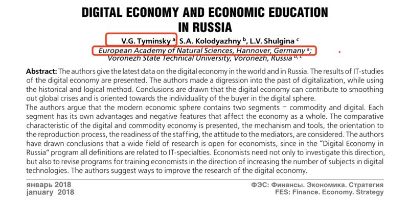 澎湃新闻通过公开的学术平台查询到,2018年,Vladimir Tyminskiy(全名:Vladimir G. Tyminsky)曾以欧洲自然科学院主席、俄罗斯自然科学院名誉首席科学秘书身份发表了一篇论文,论文主题是“俄罗斯的数字经济和经济教育”。