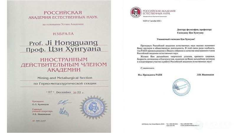 纪洪广教授当选俄罗斯自然科学院外籍院士的证书和贺信。北京科技大学官网 图