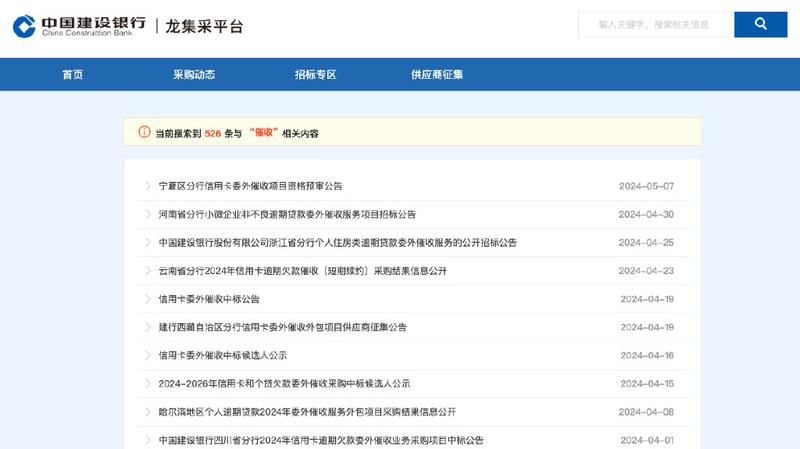 5月13日,记者登录中国建设银行/龙集采中心,检索“催收”,共检索出超500条相关内容信息,大部分内容是建设银行地方分行贷款或信用卡催收的招标或中标公告。