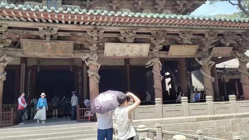 晋祠博物馆工作人员介绍,圣母殿创建于北宋太平兴国九年(公元984年),距今已有1000多年历史,是晋祠现存规模最大、最古老的建筑,也是我国宋代建筑的典范。殿前有8条形态各异的木雕盘龙,雕造于北宋元祐二年(公元1087年),也是我国唯一保留下来的古代木雕盘龙。其中北向第二条龙为网红“比耶龙”,它大半个身子前倾,伸出右爪做出的“比耶”造型与“威风凛凛”的表情极具“反差萌”。那沉淀了千年沧桑岁月的蜿蜒身躯与旁边同样“比耶”的游客同框,给人一种穿越时空的错觉,成为近期热门的拍照打卡地。