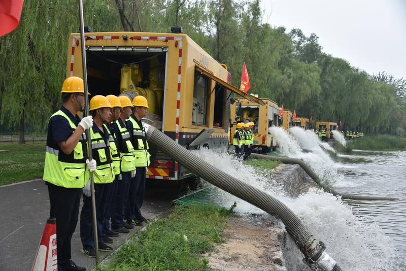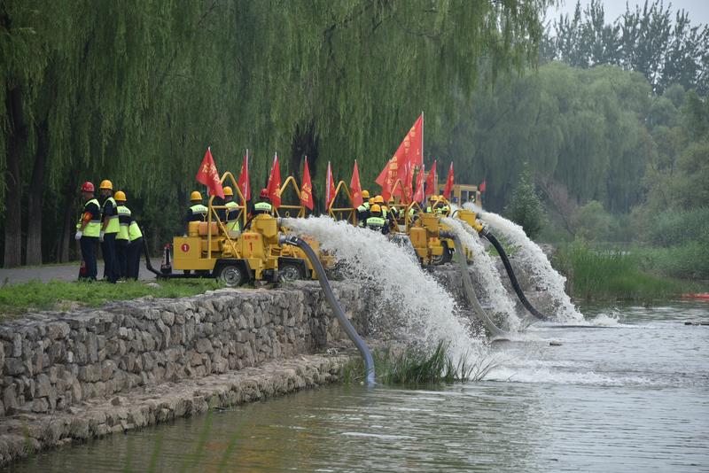 在用拖泵、电源泵车抽排“积水”时,各分队抢险队员先做好警戒围挡后,对油路、电路进行全面检查,再安装进水管和出水管,分别放到“积水”区和排放地点,随后启动电源,开始作业。随着机器的轰鸣声,“积水”被抽入管道,通过排水管排出。