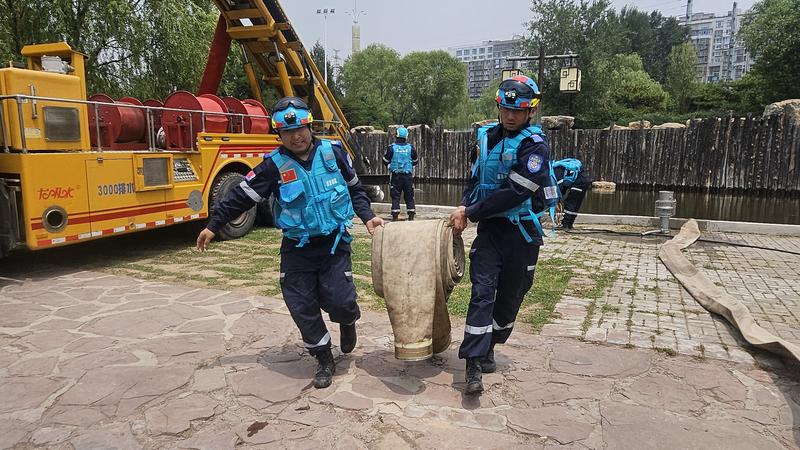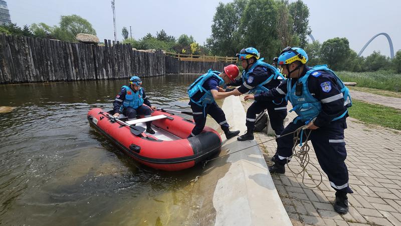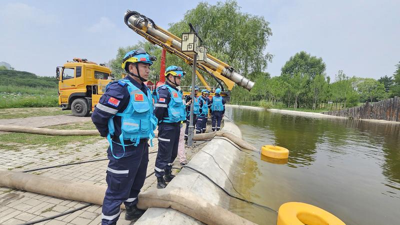 市政应急保障站则在北中环桥以北汾河东岸景区内,以太原市连续强降雨,某下穿通道“积水”过多,且水位不断上升,周边行人车辆无法正常通行,人员被困为背景,立即组织18名抢险队员前往救援来展开演练。