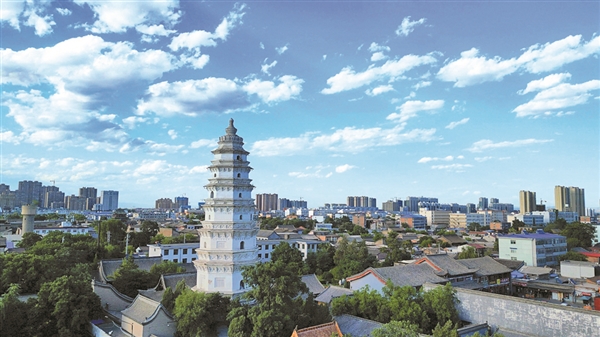 无边寺白塔建于无边寺二进院。八角七层楼阁砖塔。因塔垩色经久而白不减,色白如雪,故俗称白塔。通高43.6米。始建于西晋泰始八年(公元272年)。现存为宋治平年间(公元1064年-公元1067年)重修后遗物。