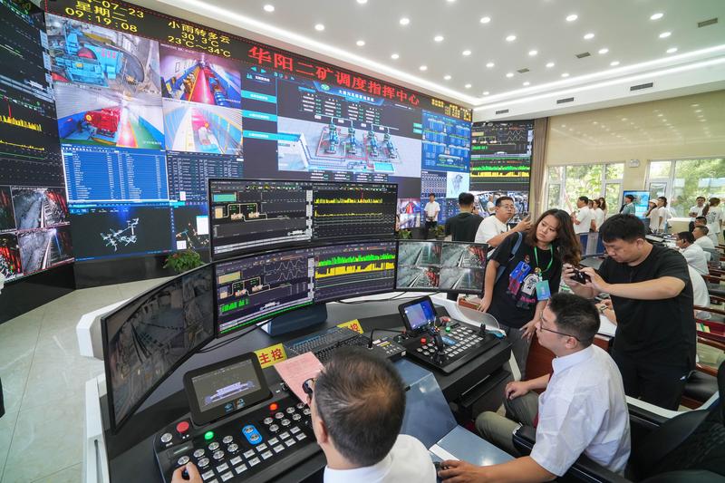 华阳二矿工作人员在调度指挥中心展示智能采矿太空舱
