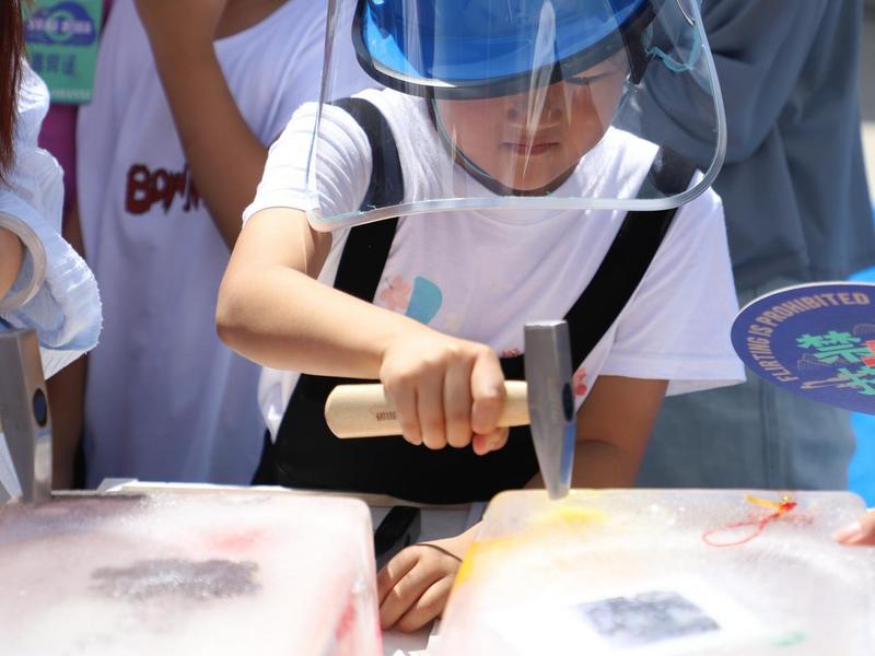随后,现场切换到了“清凉”模式,“畅游一夏,清凉山西”主题体验活动正式开始,这也是最吸引现场游客的一大环节。体验活动区域以快闪驿站的形式呈现,驿站将山西的清凉气候与旅游元素相结合,打造出了一场别开生面的夏日盛宴,其中“凿冰寻宝”环节,让体验的人重回孩童时的快乐,主办方将文创礼物封存于大块冰块之中,游客们手持小锤,亲手凿冰,寻找属于自己的夏日惊喜。