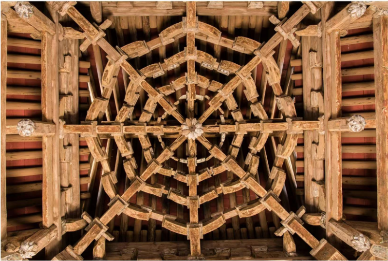 藻井也是高平古建筑中的一绝。坐落在神农镇中庙村的炎帝中庙保存有罕见精美的元代无梁殿,而大殿建筑最为精华的部分就是殿顶的藻井。