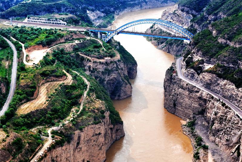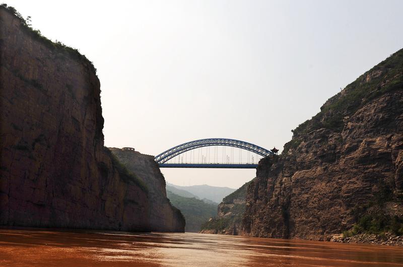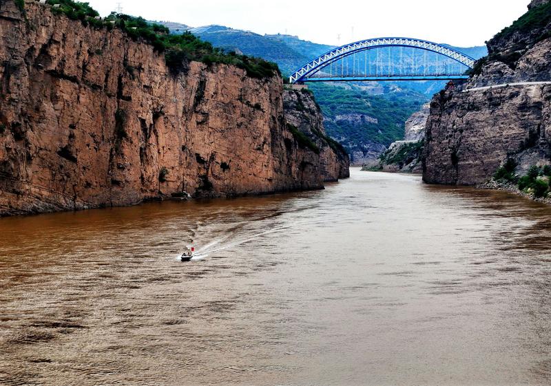 8月21日,一艘快艇载着游客从天下黄河最窄处——石门顺流行驶。石门位于黄河河津段,它是黄河“三门(孟门、石门、龙门)”的第二道门。在晋陕峡谷南端,滔滔黄河从上游奔流直下,仅从38米宽的石崖中泄出,故而得名。两岸悬崖立壁,如刀斧劈,在距河面百米的悬崖峭壁上,浩吉铁路黄河大桥依然挺立,远远望去,宛如一道雨后的彩虹,镶嵌于黄河两岸,十分壮观。