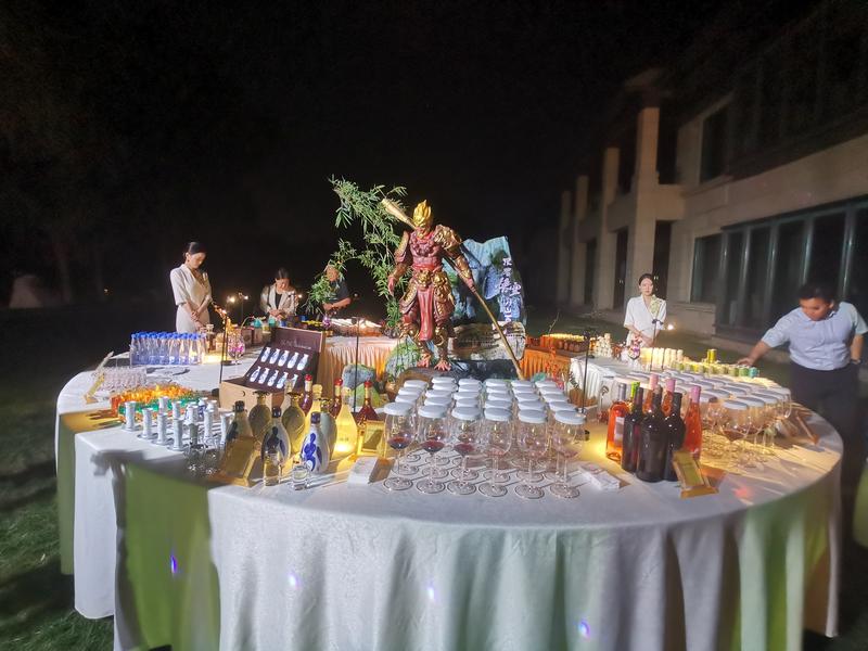 这场由山西省机关事务管理局山西会务集团呈现的“晋膳晋美”冷餐会,以《黑神话:悟空》为氛围布置主题,3D打印技术制作的2米高孙悟空造型下,美猴王屹立在云冈石窟、应县木塔等山西著名景点组成的底座之上,吸引宾客们进一步加深对山西文化、山西旅游的了解。周边是环形酒水台,分别摆放着汾酒、竹叶青、戎子干红、代县黄酒等10种酒水,台藜奶、小米乳、沙棘汁、桑葚汁等15种饮料,毛尖红茶、毛健茶、金莲花、云硒苦荞茶等4种茶,以及具有浓郁山西特色的纯手工现磨小米咖啡,盛放在搭配考究的杯子里,色泽诱人、气味芬芳。