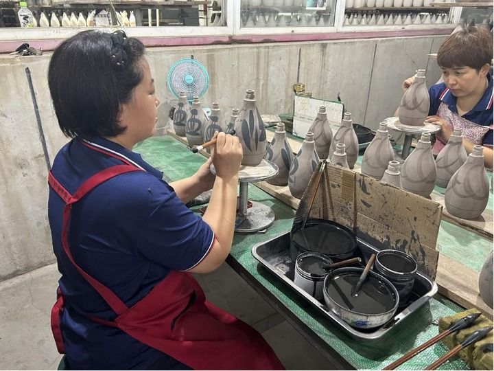 汾阳市美耀瓷业有限公司生产车间内女工正在手绘酒瓶。(赵睿摄)