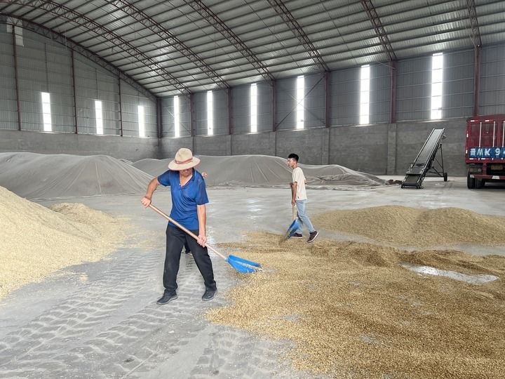 汾阳杏花兴旺种植专业合作社的工人正在晾晒粮食。