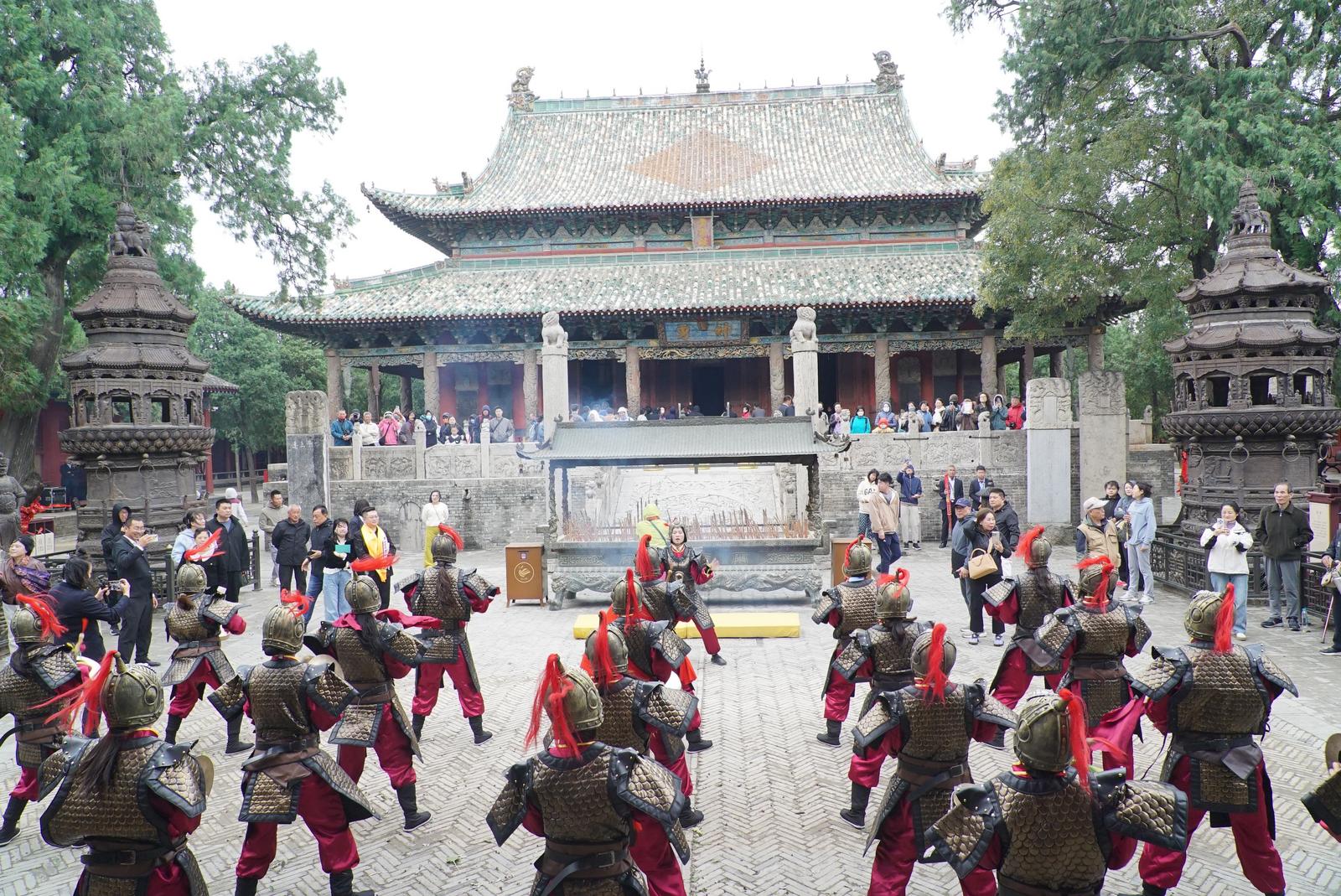 随后,关帝祖庙艺术团带来了精彩的《关公威风锣鼓》庆贺表演,激昂的鼓点、震撼的场面,让现场观众沉浸在关公文化的独特魅力之中。金牌导游也为赵先生夫妇及其他游客提供了全程讲解,让大家更加深入地了解关公故里的历史文化底蕴。