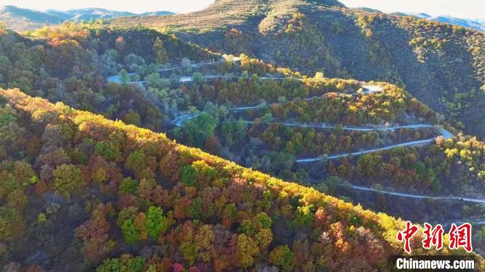 山西省晋中市昔阳县,沿着盘山公路一路上行,山坡上、峡谷里,墨绿、金黄的叶子交织其中,美不胜收。