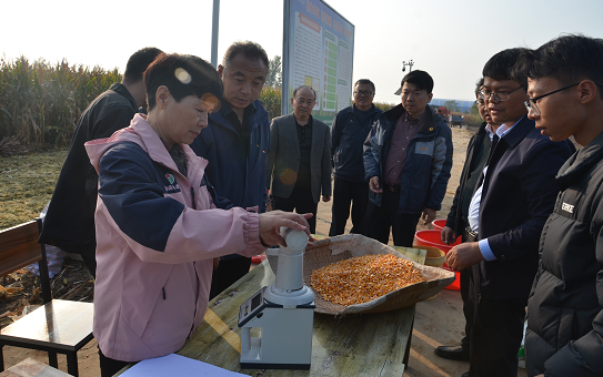 测产组严格按照《全国粮食高产创建测产验收办法(试行)》,通过清仓、面积丈量、鲜重称量、出籽率和籽粒含水率测定等程序进行。整块测产面积11.3亩,实收总鲜重16805公斤,出籽率85.19%,籽粒平均含水率29.13%,折算成14%标准含水率实际产量11797.5公斤,折合亩产1044.03公斤。