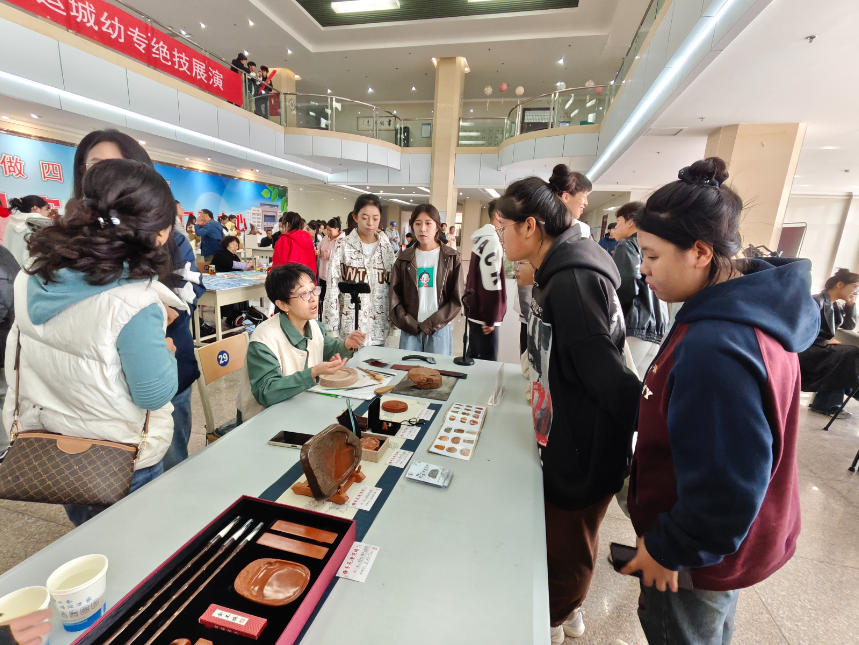 11月1日,运城幼儿师范高等专科学校内,一场别开生面的非遗展示体验活动热火朝天地开展,运城市工艺美术协会和运城幼儿师范高等专科学校美术系携手,举办的“河东非遗进校园 国粹技艺我传承”活动为师生们带来了一场传统文化的盛宴。15组来自运城的省、市级工艺美术大师,现场展示了螺钿漆器、掐丝珐琅、木版年画、铜雕技艺等15个门类的非遗技艺,让全校师生们近距离感受传统文化的独特魅力。