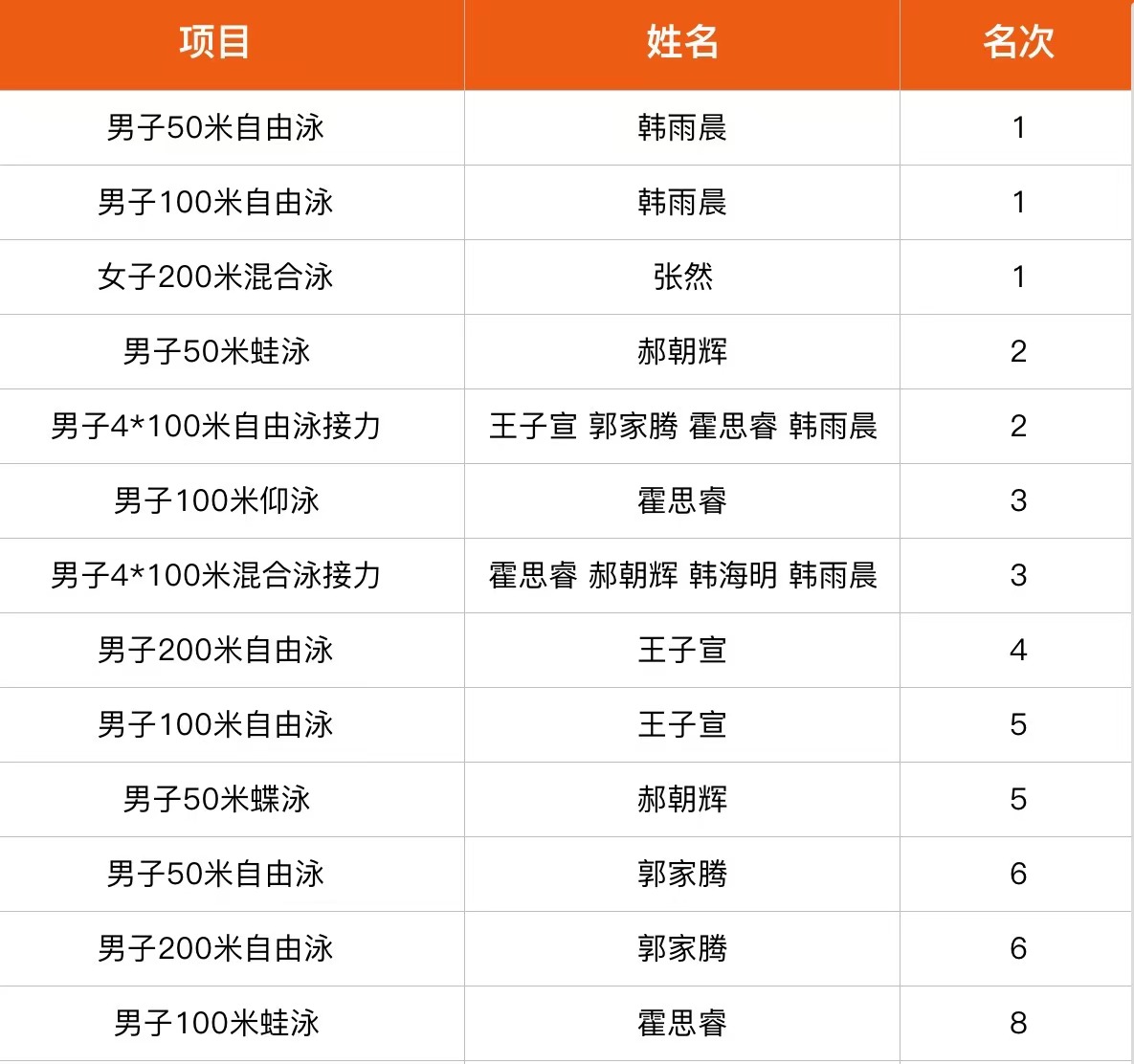 此次比赛,山西工程技术学院代表团由学院党委委员、副院长叶玉刚为领队,携学院3位教师,7位学生组成。经过激烈角逐,山西工程技术学院参赛运动员共取得3金2银2铜的优异成绩,其中,两项冠军成绩超出国家二级运动员标准;团体项目中分获4*100米自由泳接力赛亚军,4*100米混合泳接力赛季军,在报名人数不限的赛制下,获得大学校园组团体总分第三名,创历史最佳成绩。