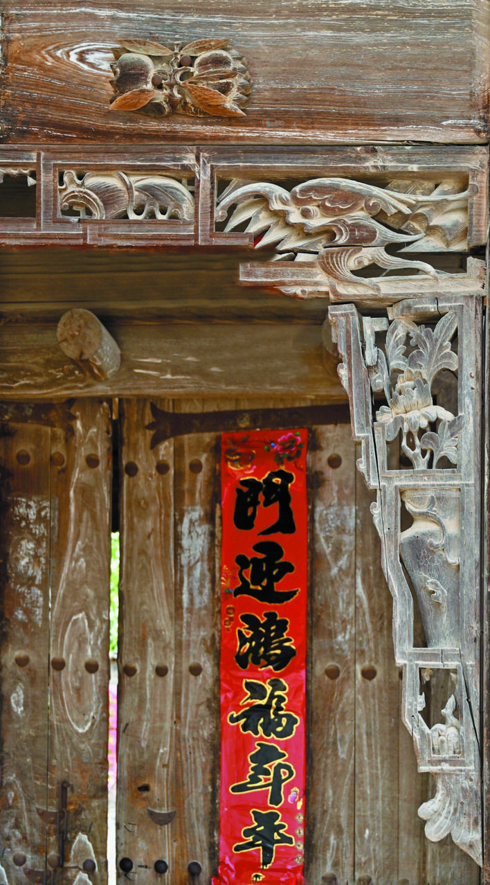 阑额上有石榴木雕匾托,雀替镂空雕刻精美,有牡丹、花瓶和草龙等纹饰。