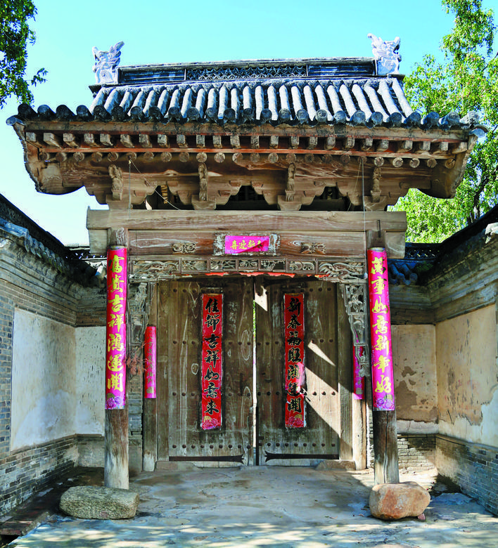 忻府区韩岩村任氏民居大门,建于清同治三年。柱枋上设五朵斗拱,雕饰华丽。