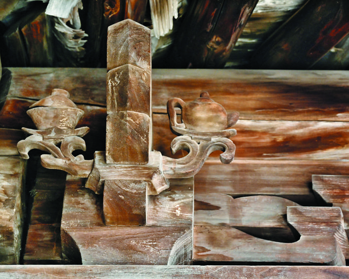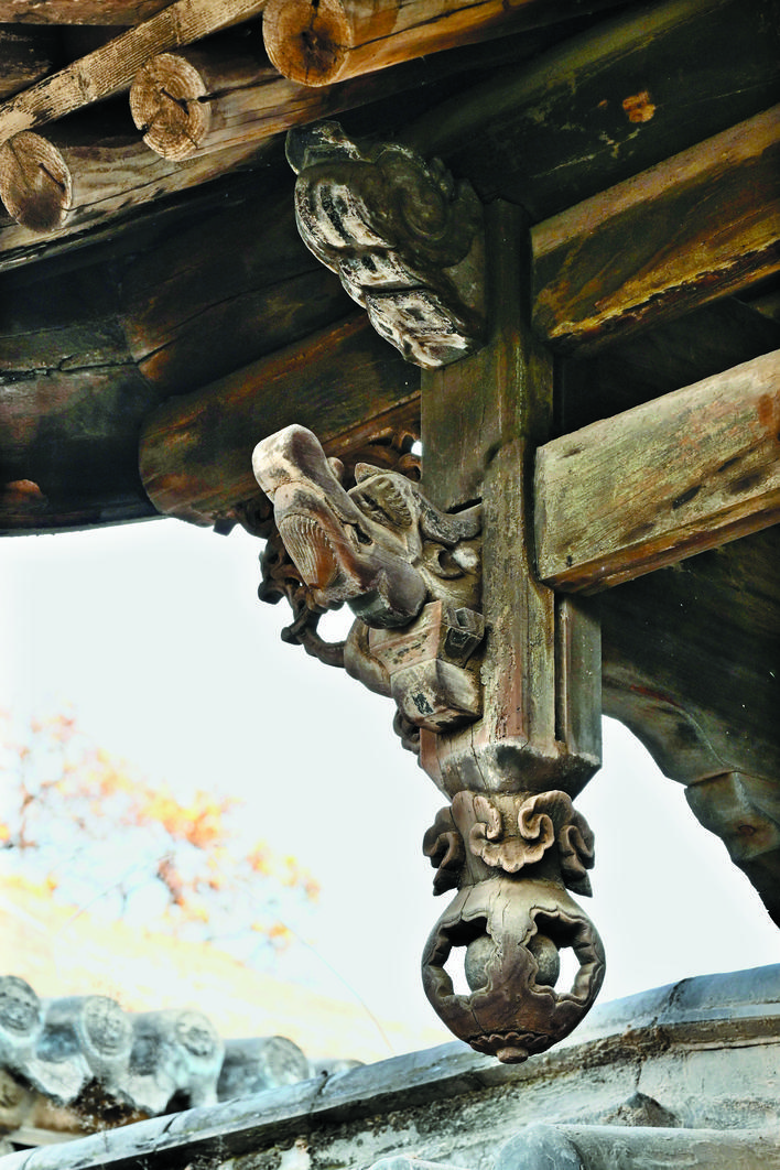角柱斗拱上的龙首斜拱,龙珠耍头,云纹瑞草厢拱,纹饰繁缛。