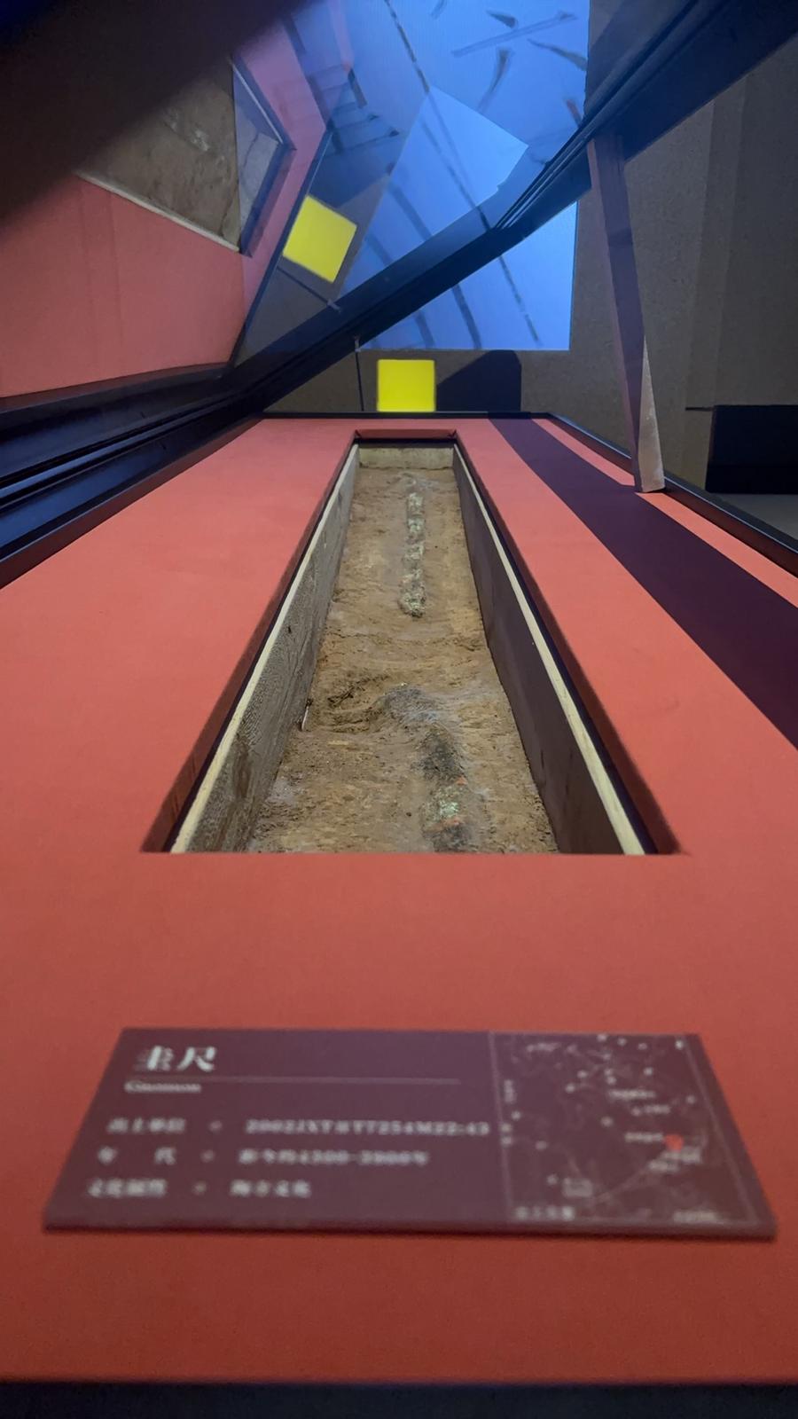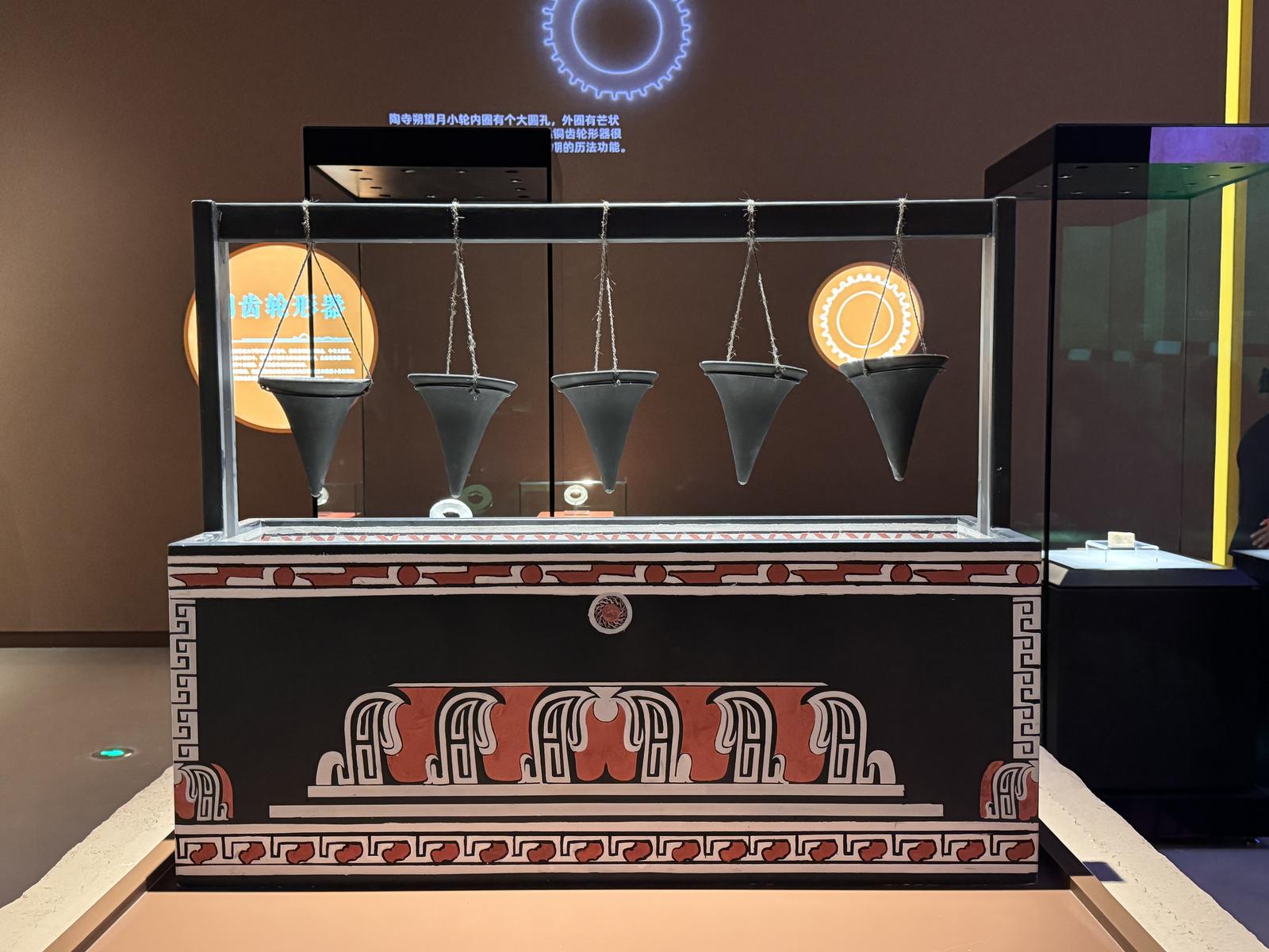 展厅内运用视频、示意图和复制模型,展示了从陶寺中期王墓内出土的大漆箱。“这个大漆箱有存放‘沙漏’的遗迹,这一发现补全了陶寺的计时体系。这样,我们就不难发现,陶寺时期已基本形成了一套年、月、日、时的计时系统……”