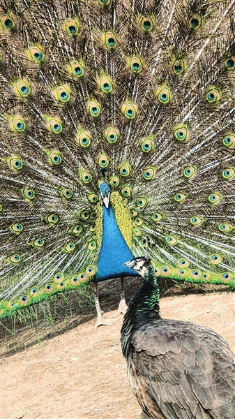 阳光照射下,孔雀尾屏上的“眼状斑”熠熠生辉。