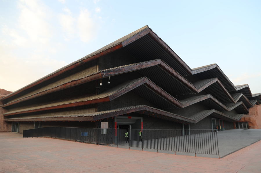 《又见平遥》剧场外观,黄土与瓦片交织的宏伟建筑。