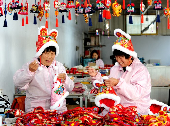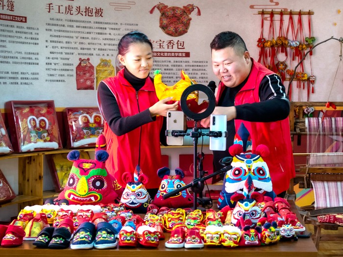 1月6日,寒冬时节,在万荣县解店镇北解村的鑫昌达手工制品有限公司扶贫车间工人们正在忙着赶制“虎头”制品。手手工缝制的虎头帽可爱大方,中国风的婴幼儿唐装汉服祥瑞儒雅,还有一件件琳琅满目的虎头鞋、虎头斗篷、虎头包被、肚兜、香包挂件……让人目不暇接。年关将近,正是民俗产品销售旺季。年轻人正在热火朝天地进行线上直播带货,产品销往全国各地,每年创收百余万元,同时解决了80余人就近务工,助力家门口就业增收。