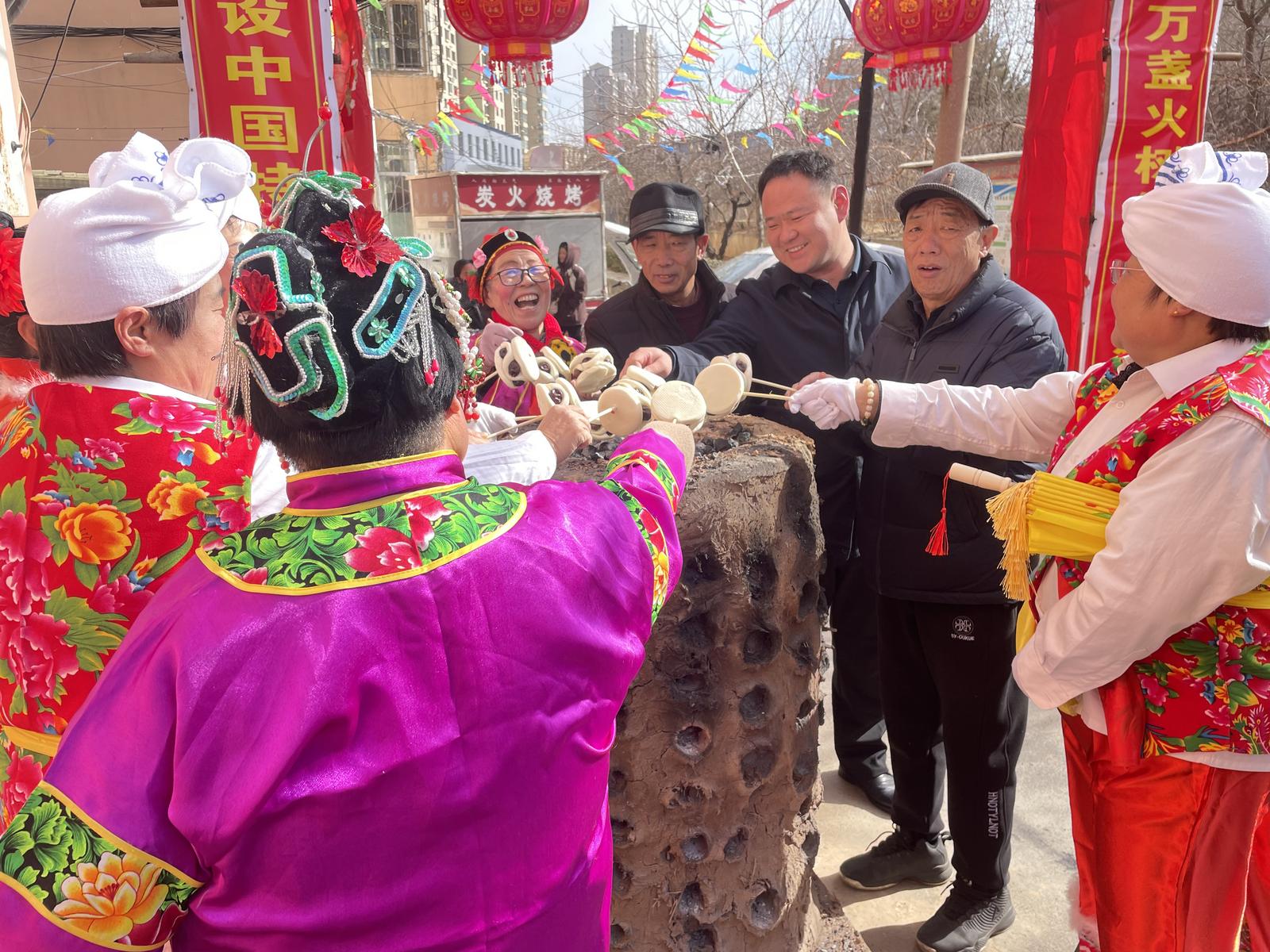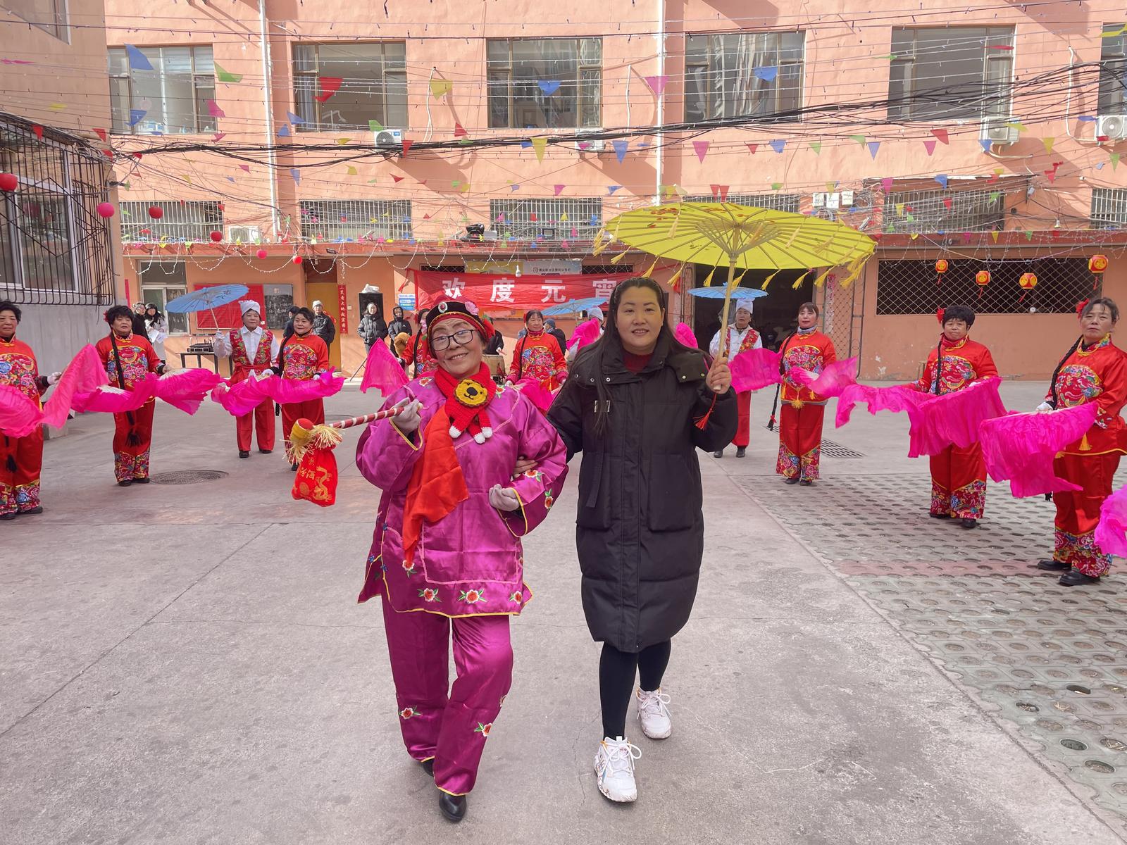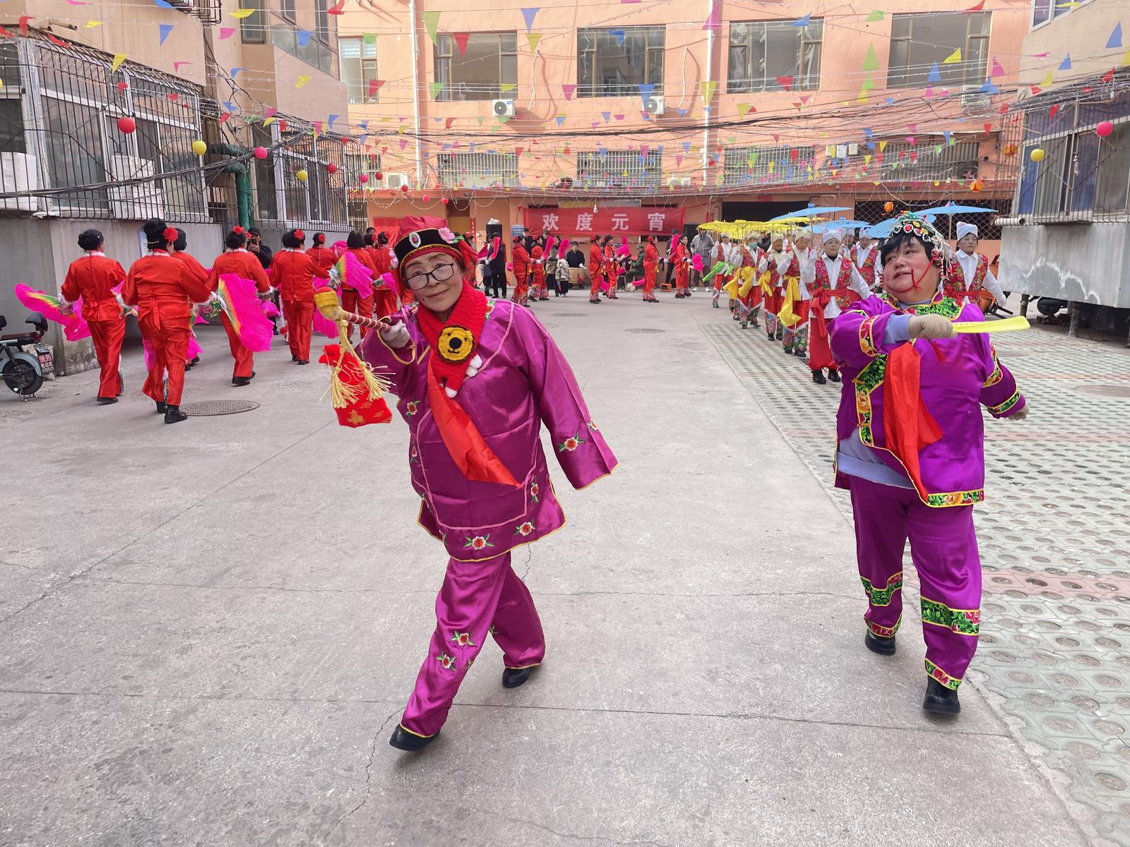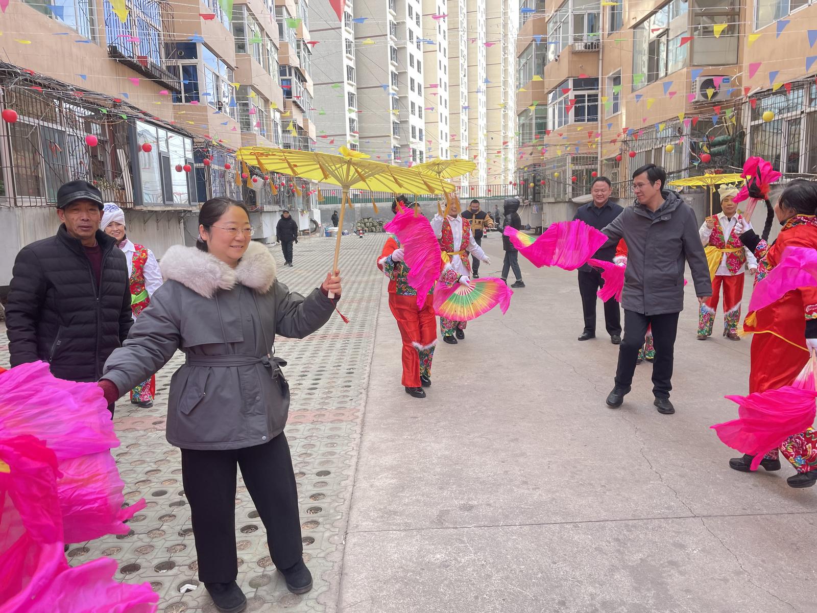 一大早,义井矿小区里就热闹非凡,居民们自发组织闹红火表演热闹开演。大家身着鲜艳的服装,迈着欢快的步伐,敲打着喜庆的锣鼓,扭起了欢快的秧歌,整个小区沉浸在一片欢乐祥和的节日氛围中。小区党组织和物管会工作人员化身厨师和志愿者,在小区院内支起大锅,配合大师傅现场做拉面和大锅菜,为居民群众送上一碗碗热腾腾的美食,也献上了小区党组织对居民群众美好生活的祝福。