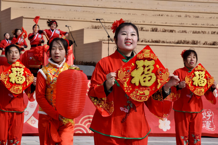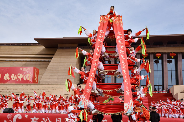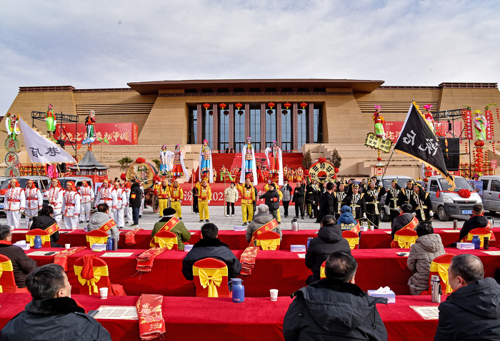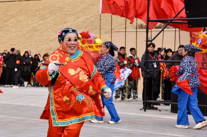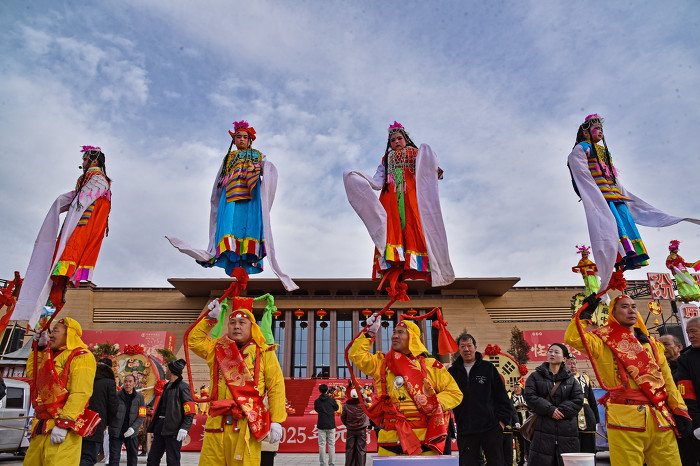 2月12日,社火队在临汾市陶寺遗址博物馆南广场表演传统社火节目。 当日是元宵节,临汾市襄汾县2025年元宵节社火展演活动在该县陶寺遗址博物馆南广场火热上演,锣鼓、舞龙、高跷、抬阁、花鼓、秧歌等非遗社火节目轮番展演,精彩纷呈,人们在热闹红火的气氛中欢度元宵佳节。
