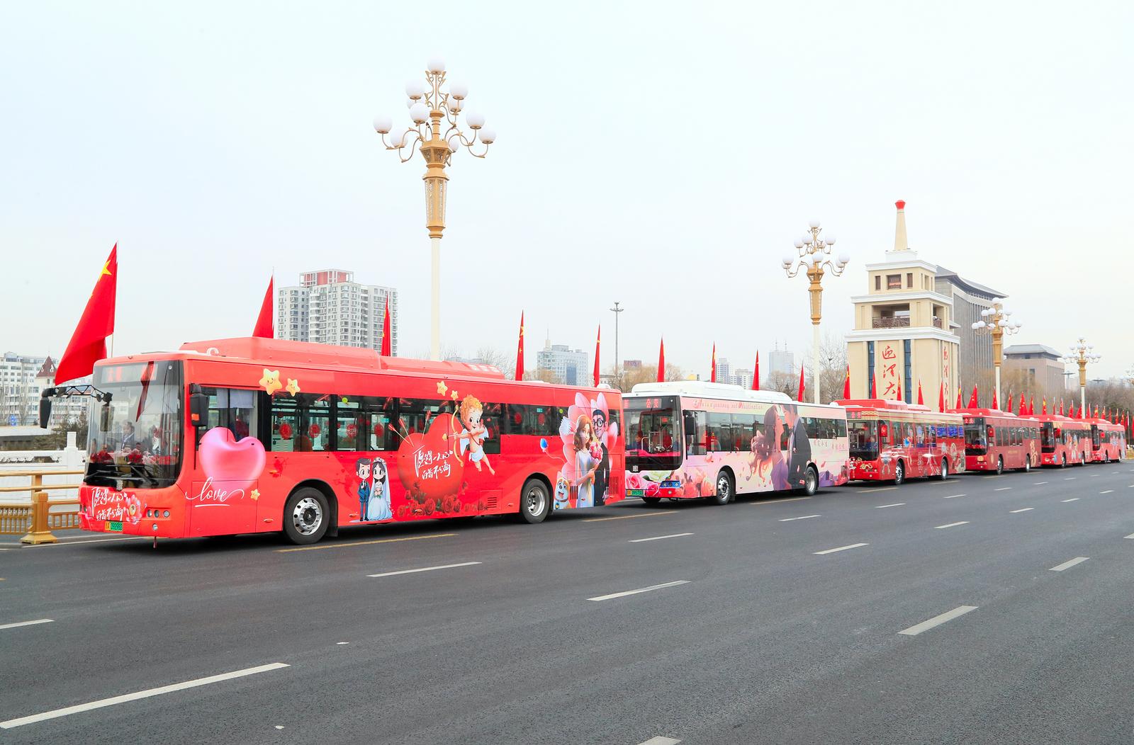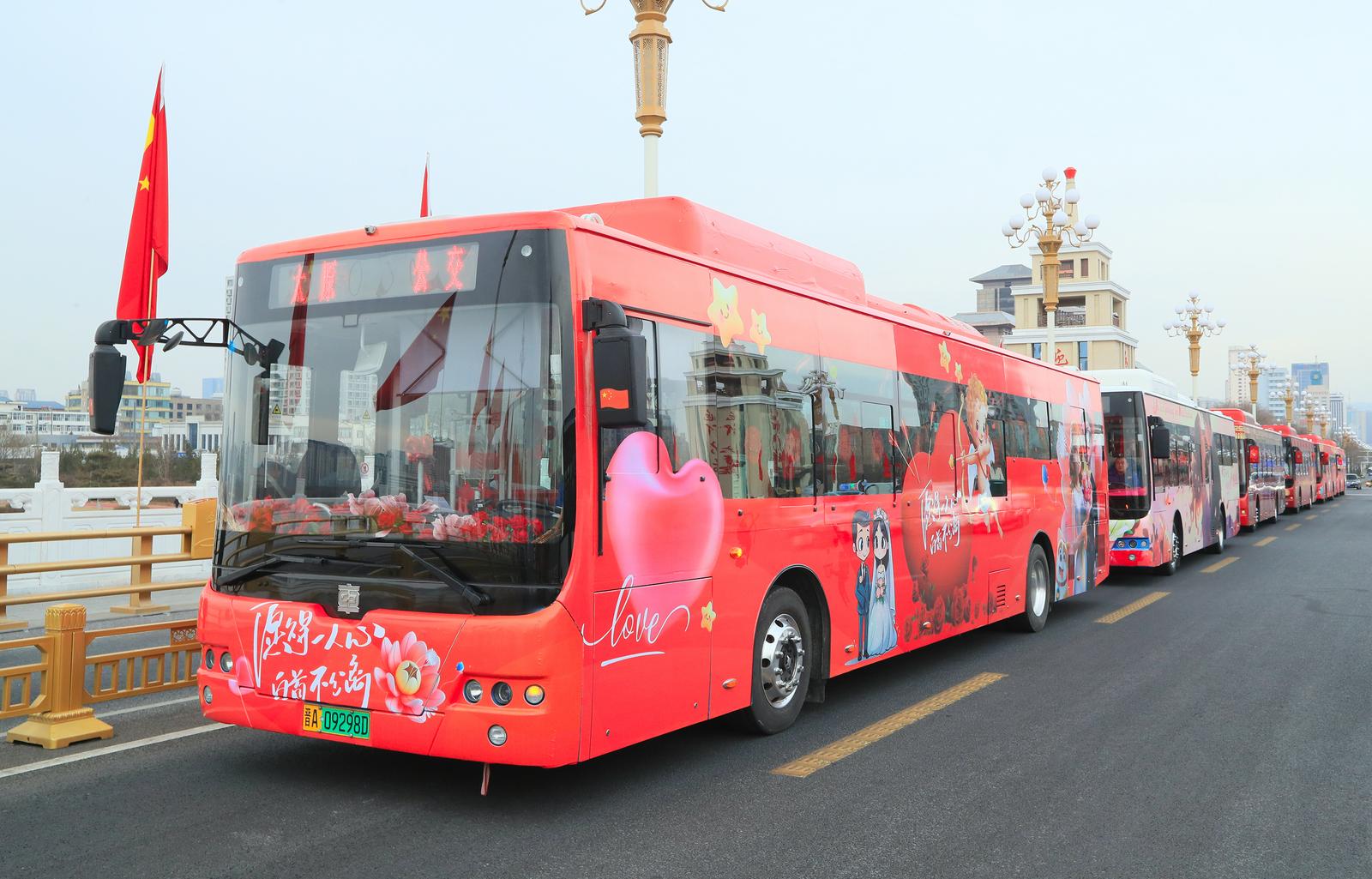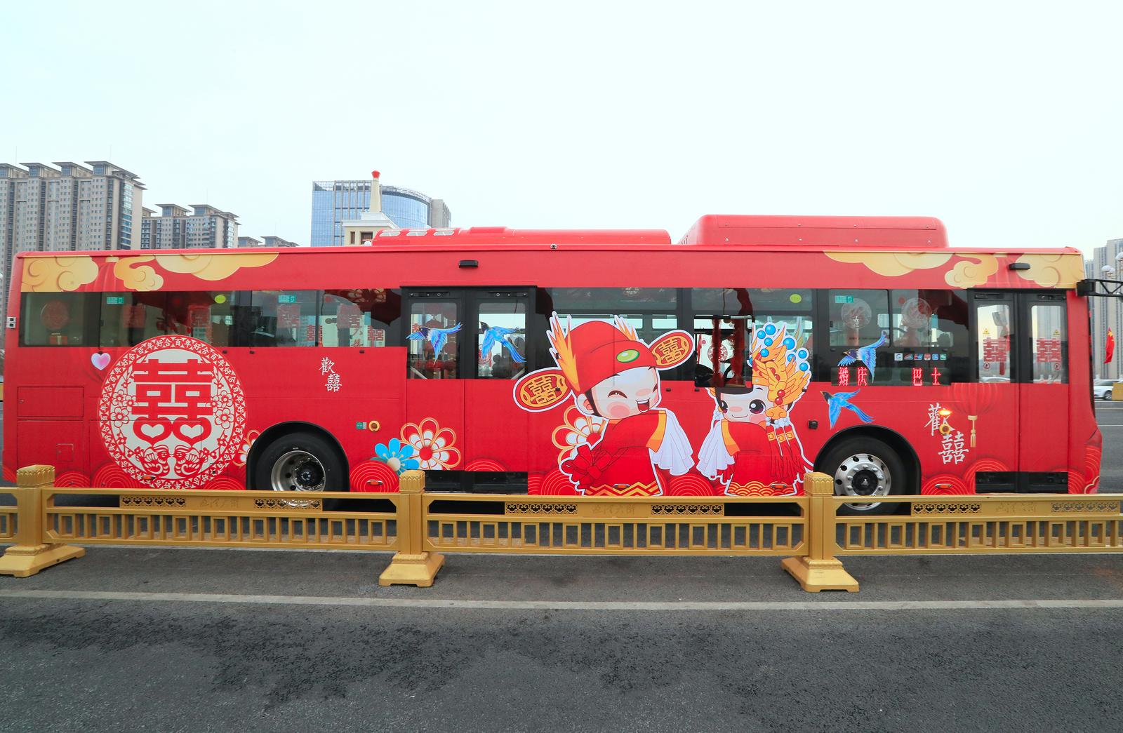 山西日报新媒体记者卫波报道 2月14日,定制婚车亮相龙城街头。当日,太原公交公司6台主题定制婚车上线。公交车变身幸福巴士!