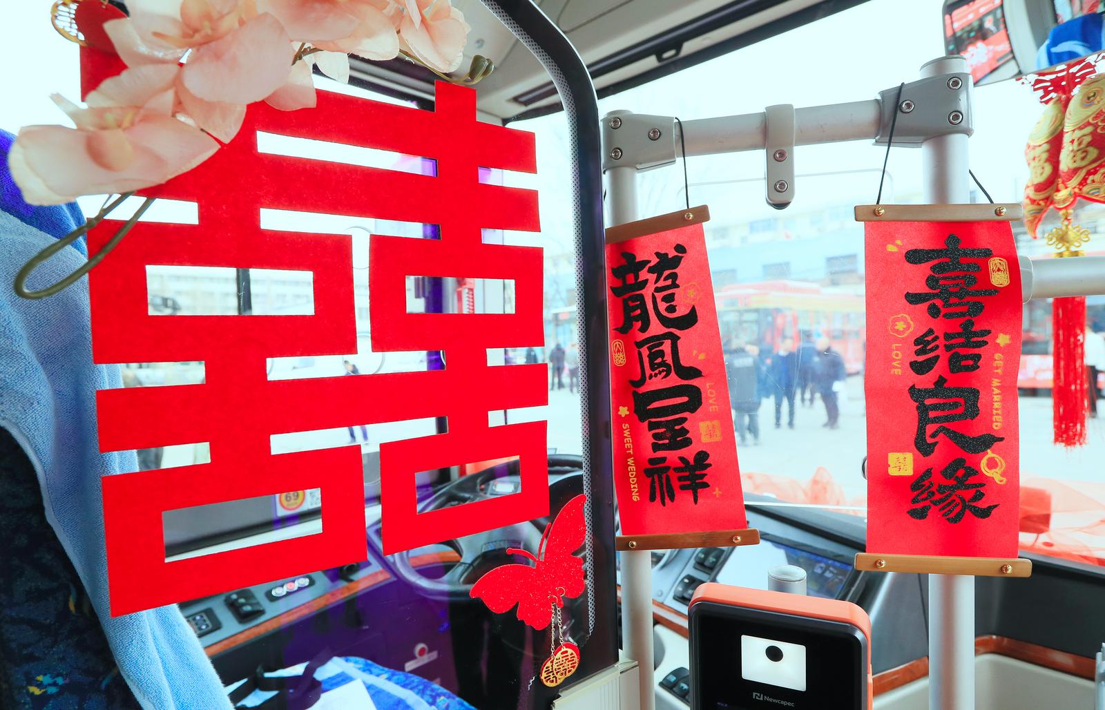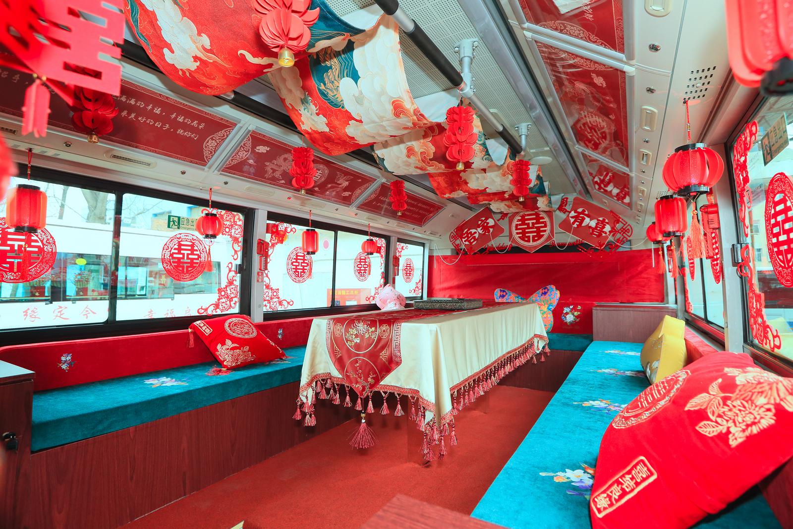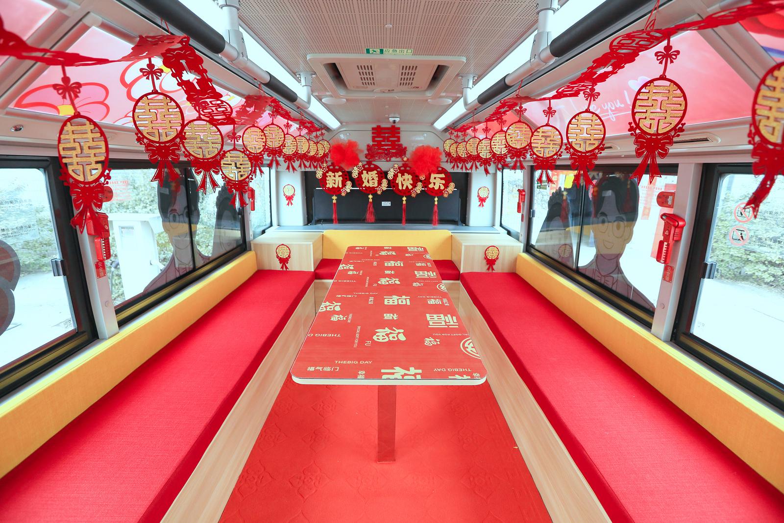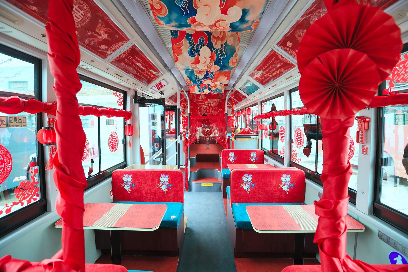 车辆的外部喷印了婚庆标识,车头装饰着喜庆的鲜花。车厢内部焕然一新,不仅车窗有喜字贴,顶棚布满拉花装饰,以往用于展示公益广告和乘车规则的灯牌位置,通通换上“佳偶天成”“喜结良缘”“永结同心”等祝福语的“新装”。车内的座位布局也进行了重新设计规划,以软包卡座的形式,成为太原街头的“移动会客厅”。