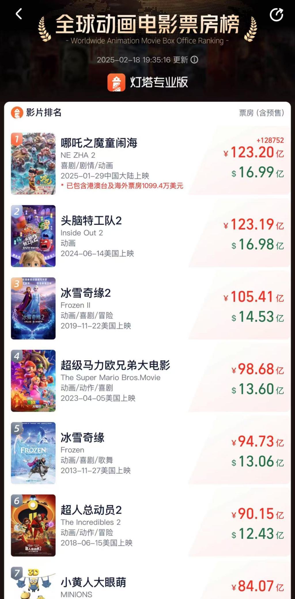 山西日报客户端综合报道 2月18日晚间,据灯塔专业版数据,《哪吒之魔童闹海》(即《哪吒2》)总票房(含预售及海外)达123.2亿元,超过《头脑特工队2》登顶全球动画电影票房榜,同时位居全球影史票房榜第8名。