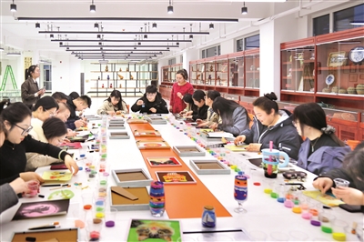 图为3月27日,青年们在夜校学习工艺沙画。