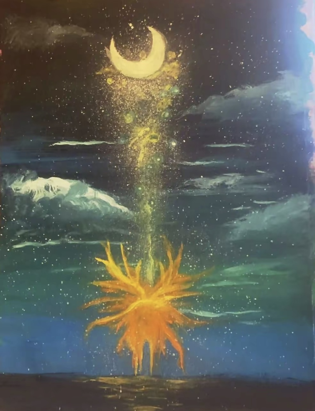到这年10月,她展示了自己的油画画作,上方是一轮弯弯的明月,拨开云雾,画面下方是绽放光芒的橙色太阳。淡蓝的背景上日月同辉,她说,“画画,真的是太开心了,我可以永远不出门吗?”