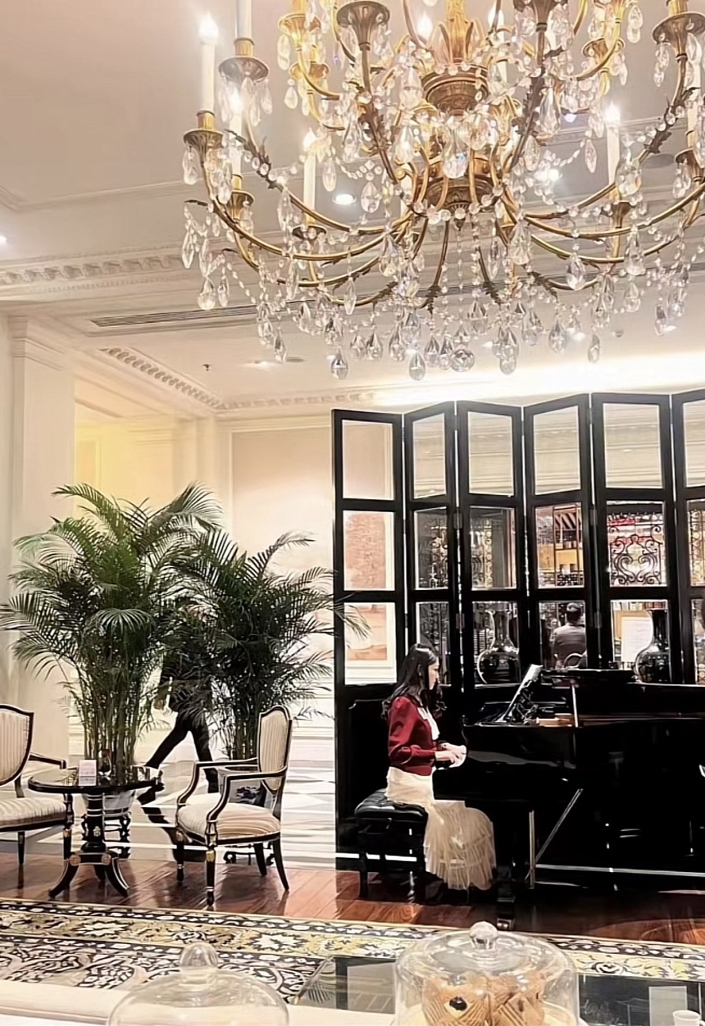 有优雅的艺术时刻。圣诞节,酒店里装饰着亮灯的圣诞树,在桌上摆放着红衣小狮子玩偶。“钢琴小姐姐很漂亮,弹得非常好”,有观众在网络上点评道,说的就是酒店钢琴师解岳千。