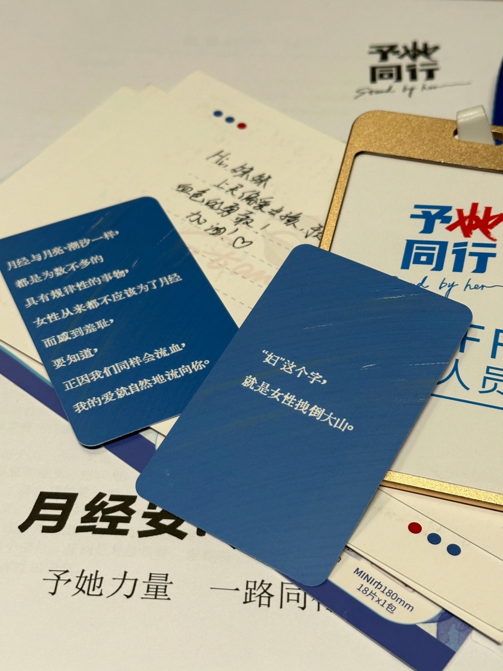 露西记得,在微博上看到这些条目之前,自己就想过在学校的女卫生间里放卫生巾,方便同学们互相借用,但又听说其他女生这么做,被保洁阿姨阻拦,说要学校审批,就搁置了。隔一阵,露西听说有同学放置成功,还张贴了“予她同行”的宣传海报。