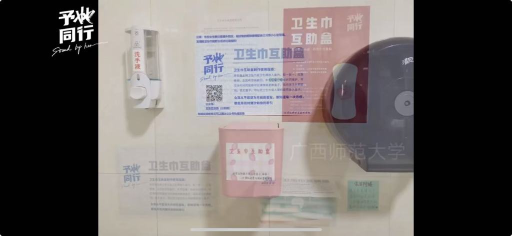 据“予她同行”微博,一些大学女生使用其物料宣传“卫生巾互助盒”理念。