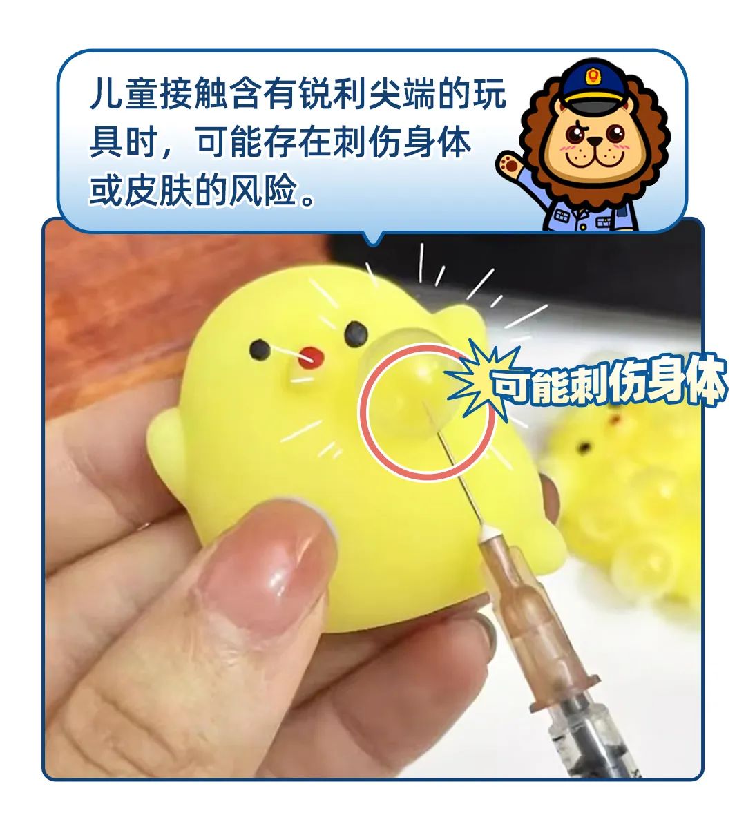 上海市市场监管局提示,建议消费者不要给孩子购买使用含有注射器针头的玩具;生产者应提供安全性更高的替代工具或者改进玩具软塑料体的原材料配比、生产工艺,使非锐利尖端类工具也能实现其玩耍功能;销售者应验明产品名称、厂名厂址、执行标准、质量检验合格证明等信息,不采购、销售来源不明或无中文标明产品名称、厂名厂址、合格证明的产品。