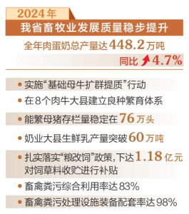 以“大农业观”重构产业版图,以“大食物观”重塑供给体系,我省畜牧业发展质量稳步提升。2024年,全年肉蛋奶总产量达448.2万吨,同比增长4.7%。这场逆袭背后,是资源整合的智慧、产业升级的魄力,更是对“向生态要效益”的生动诠释。