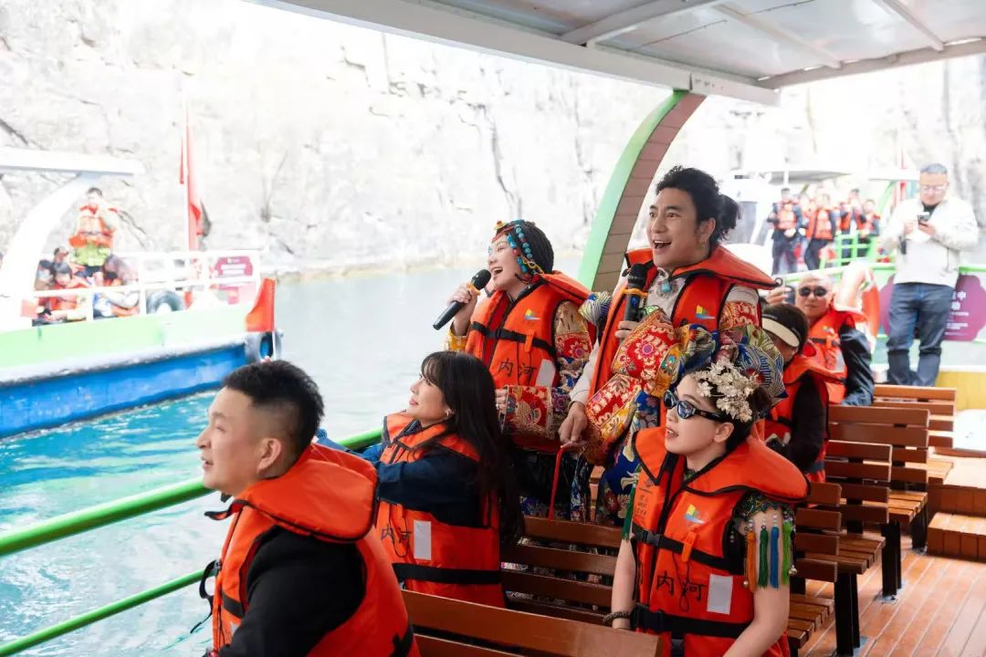峡谷游船项目创新植入文化体验,游客在碧波荡漾间聆听太行山歌,船行至高峡平湖深处,专业讲解员结合实景为大家声情并茂的开启关于地质变迁、人文历史的精彩讲述。在“喊山大会”环节,大家跟随手风琴的演奏共唱祖国,多人和声在山谷间形成独特混响,参与者通过“山歌接龙”互动,亲身感受民歌艺术的感染力。