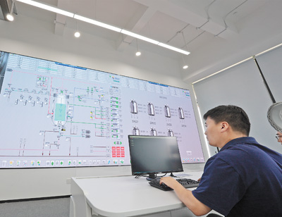 在华熙生物中试成果转化中心智能中控平台,工作人员监测各车间运行情况。资料图片