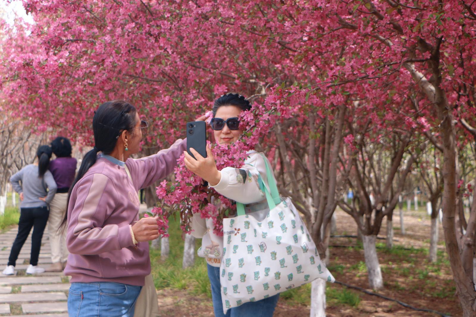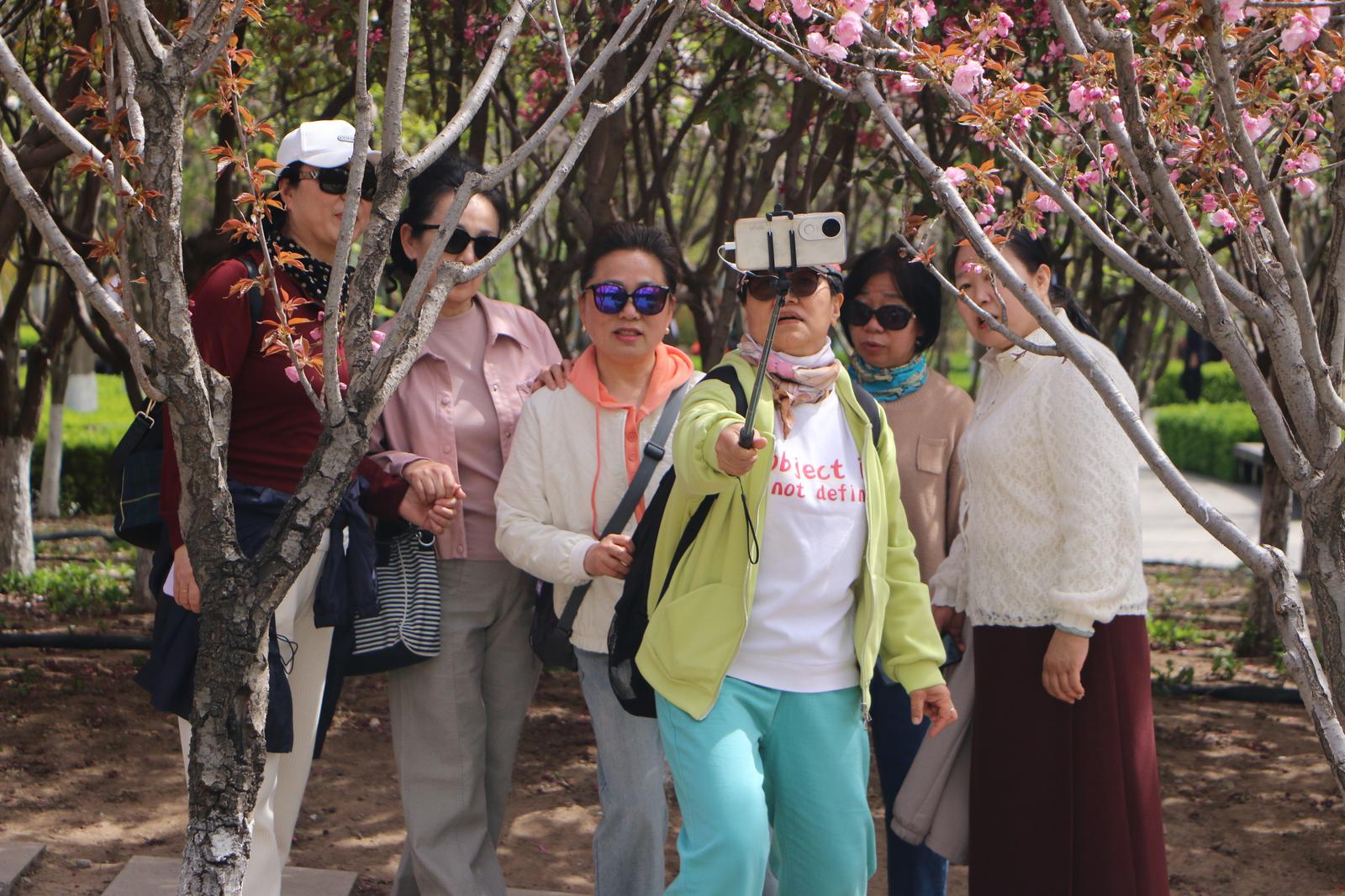 公园内,观赏樱花的市民络绎不绝,徜徉在花海中,他们纷纷拿出手机留影打卡。刘女士高兴地说:“一听说和平公园的樱花开了,我立马就约了老姐妹们来欣赏、打卡,这儿的樱花真的太美了!”