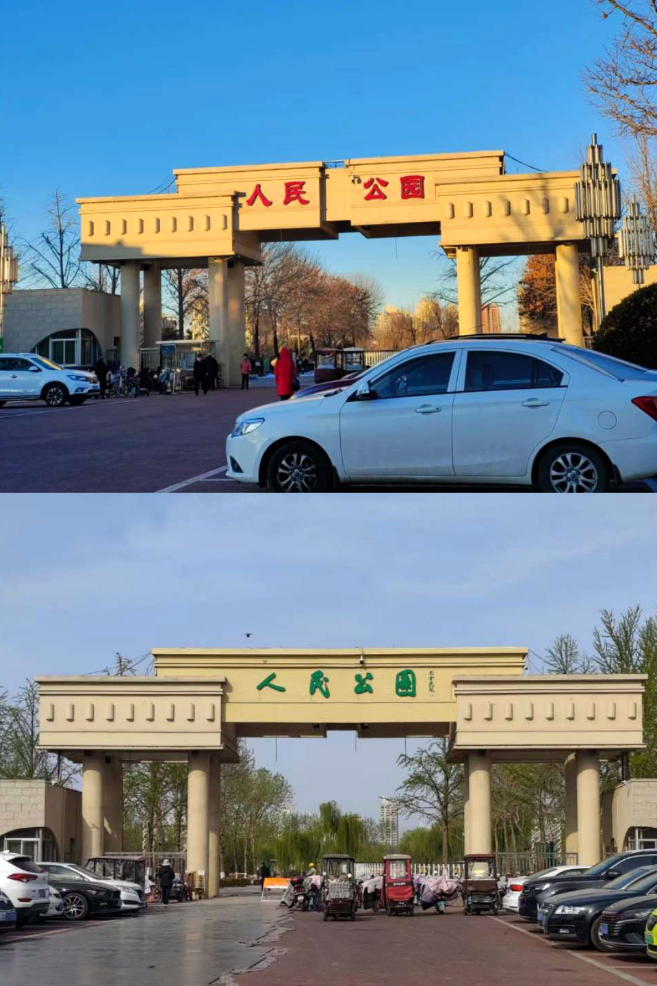 上图:人民公园门牌改色前为红色,下图:人民公园门牌改色成绿色。
