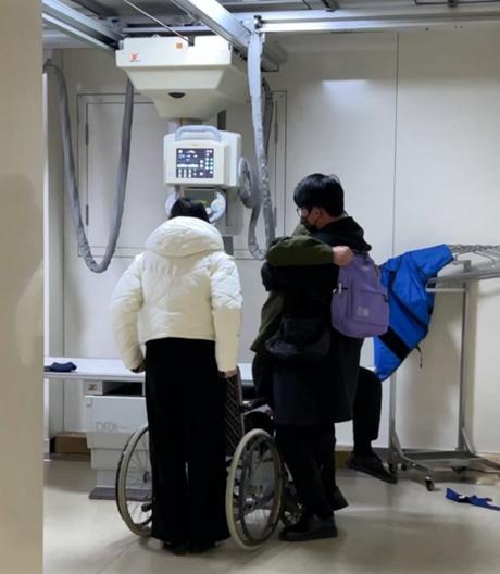 陪诊师历春升(右一)将腿脚不便的患者扶上检查台。受访者供图