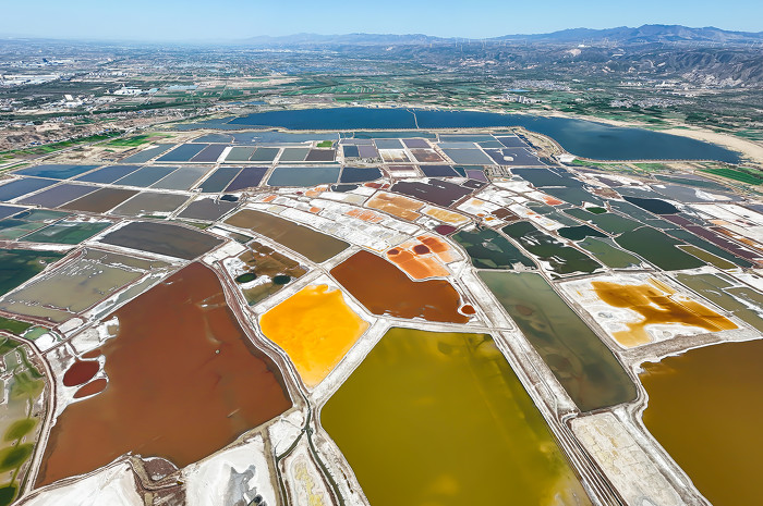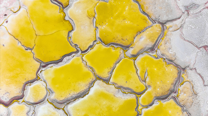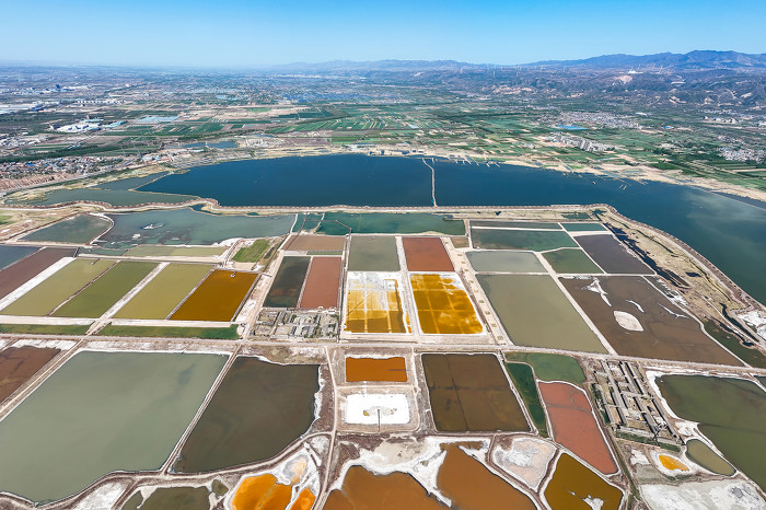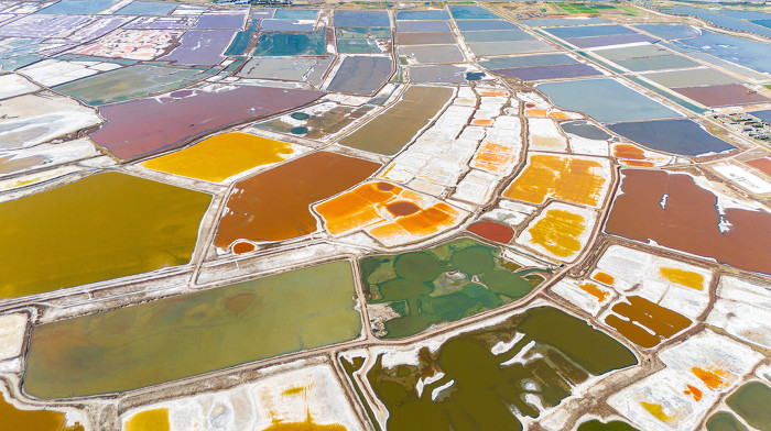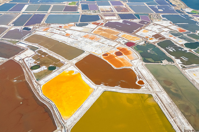 4月14日,随着气温不断升高,运城市七彩盐湖呈现出五彩斑斓的美丽景观。从空中俯瞰,盐湖宛若巨型大自然调色板,令人陶醉。