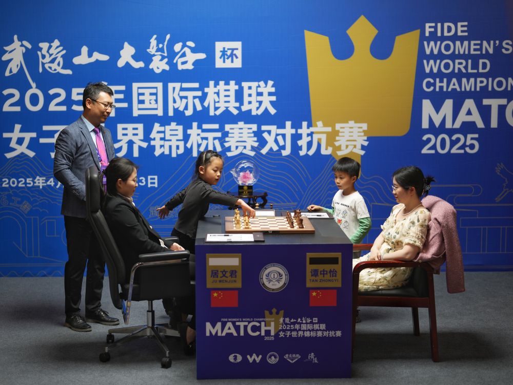 两位小棋手成为当日比赛两位前辈的开棋嘉宾,执白先行的卫冕冠军再度选择王兵起步,谭中怡继续应对以西西里防御。有备而来的居文君走出新的变化,顺利取得较为理想的局面。此后她也选择了较为简单的处理方式,双方进行大量子力交换后进入均势的车兵残局,在第38回合形成重复局面,不变作和。