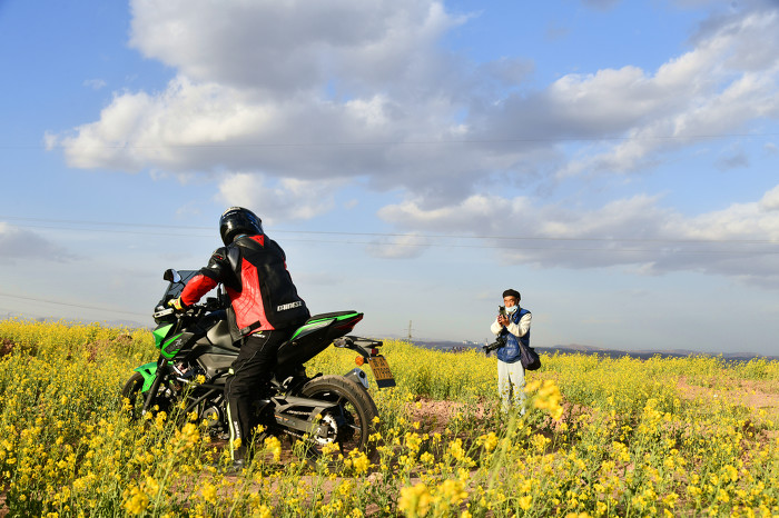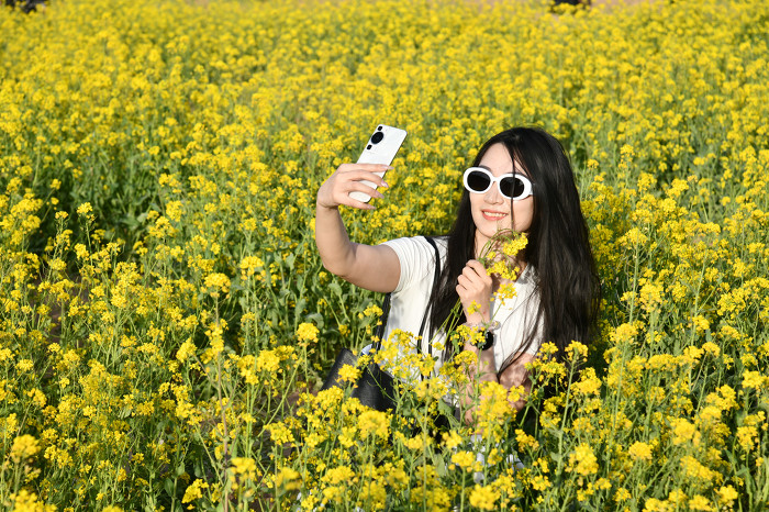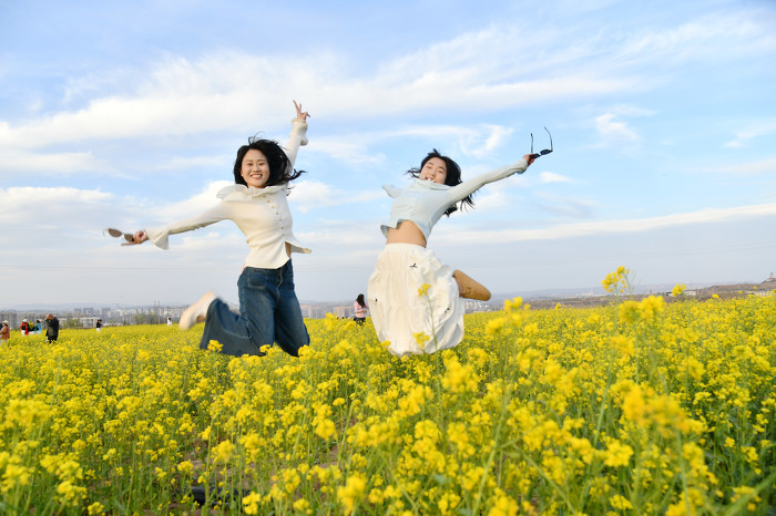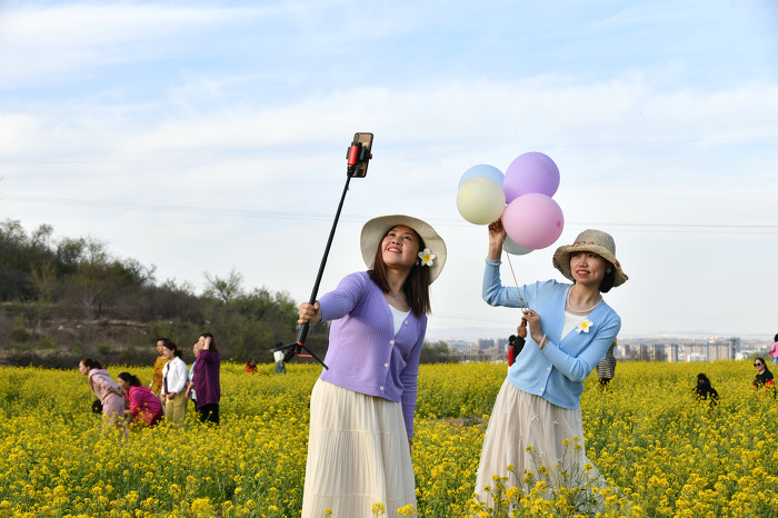 连日来,阳泉市城区义井镇南庄村,一片由荒坡打造的油菜花地与蓝天白云相互映衬,构成一幅美丽画卷,吸引市民前来打卡,热度持续不减。