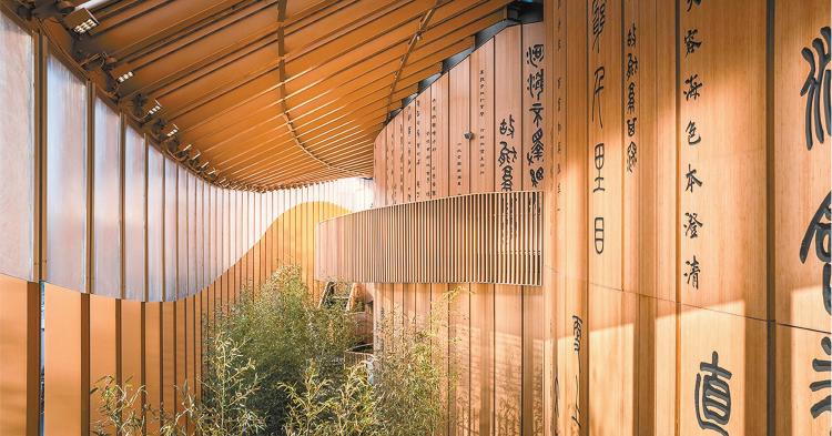 中国馆的外形与内部结构存在许多不规则的流线型形态,这对设计与建造带来了不小的挑战。据孙建超介绍,竹简板表面的文字是由中国美院书法家在纸上书写,再转拓至电脑软件,最后使用雕刻机在竹简板上进行雕刻。文字涵盖了篆体、隶书、楷书、行书、金文、甲骨文6种字体。为了最好地呈现设计效果,建造团队在国内搭建了1∶1的样板墙,经过精挑细选,最终确定了样板颜色和工艺方式。