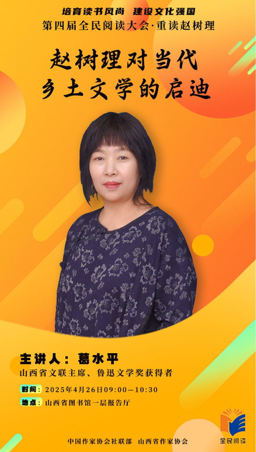4月26日9:00,山西省文联主席、鲁迅文学奖获得者葛水平将作《赵树理对当代乡土文学的启迪》主题讲座,结合自身创作经历与深厚文学积淀,阐述赵树理文学对当代乡土文学发展的重要启示。