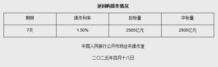 山西日报客户端综合报道 据央行网站消息,2025年4月18日中国人民银行以固定利率、数量招标方式开展了2505亿元逆回购操作。具体情况如下: